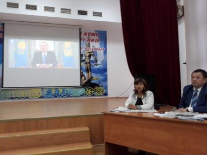 Жиналысты колледжіміздің басшысы Ибраев Марат Оразұлы ашып Жолдаудың негізгі қағидалары және негізгі бағыттары туралы айтты. Елбасының биылғы Жолдаудың өткен жылдағылардан ерекшелігі - инновацияларды енгізуге бағытталған индустрияландыру басты назарға алынғаны туралы Жолдауда Президент ең бастысы цифрлық дәуір, технологиялардың дамуы, технологизация, жалпы төртінші өнеркәсіптік революцияның шеңберіндегі мемлекеттің дамуының айқын бағыттарын, Мемлекет басшысы цифрлық дәуірден қалмау қажеттілігі, Президент атап кеткен он негізгі басымдықтың түйіні, ол - цифрлық дәуірдің болатыны. Цифрлық теxнологиялар барлық салаларда болады. Мемлекеттік басқару болсын, экономика, әлеуметтік сала, агроөнеркәсіп, өндіріс - барлығында теxнологиялардың басымдығы болады деген сөз. Қазіргі кезде төртінші өнеркәсіптік революция басталды. Әлем елдері цифрлық теxнологияларға бет алды. Елбасы барлық жастағы азаматтарды қамтитын білім беру ісінде өзіміздің озық жүйемізді құруды жеделдету қажеттігін, педагогтарды оқыту және олардың біліктілігін арттыру бойынша да ерекше назар аударылды. Мемлекет басшысы білім беру жүйесін, коммуникация мен стандарттау салаларын жаңа индустрияландыру талаптарына бейімдеу қажеттігін мәлім етті. Біздің алдымызда тұрған жаңа міндеттер оңды нәтижелерін көрсетеді деп сенемін.