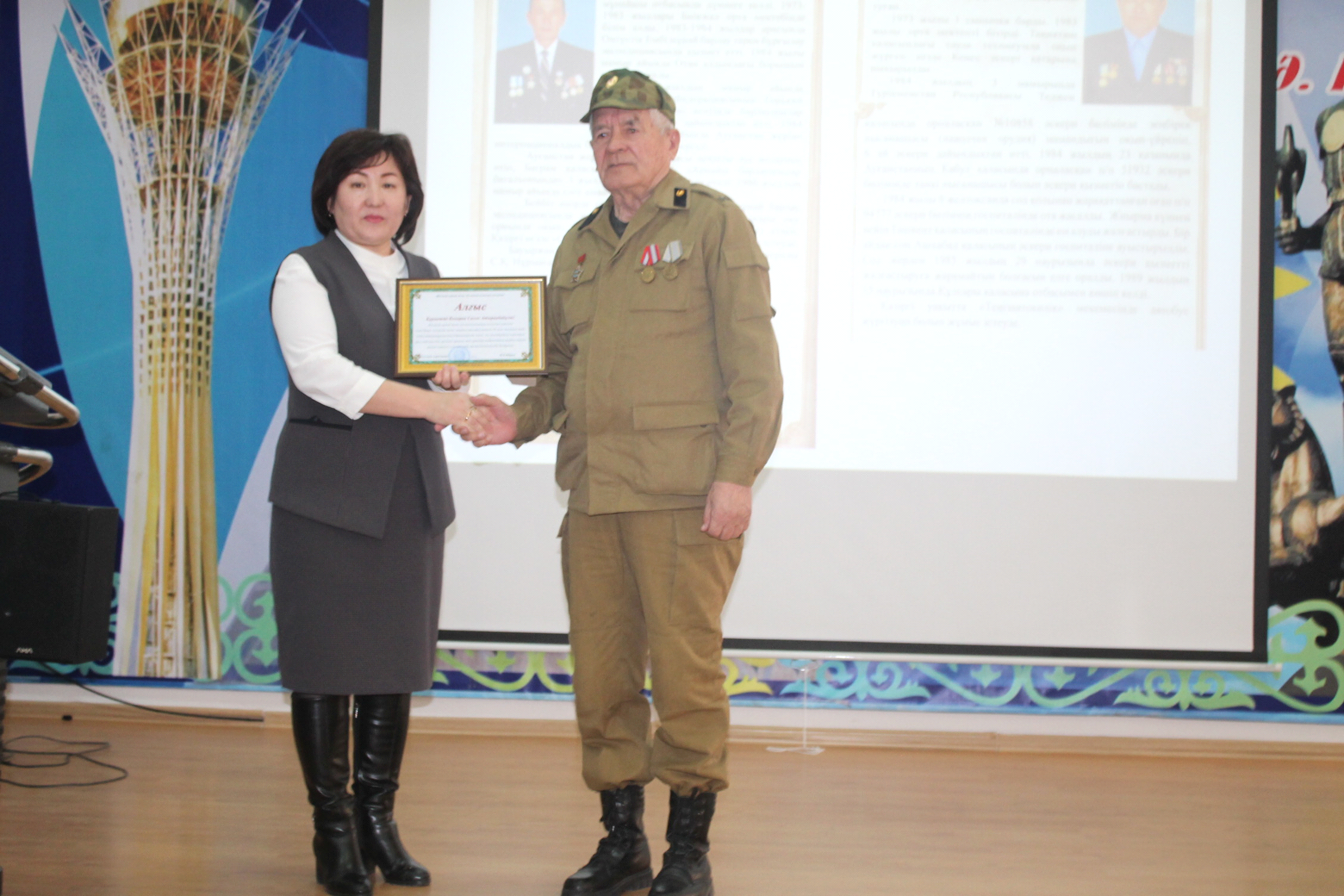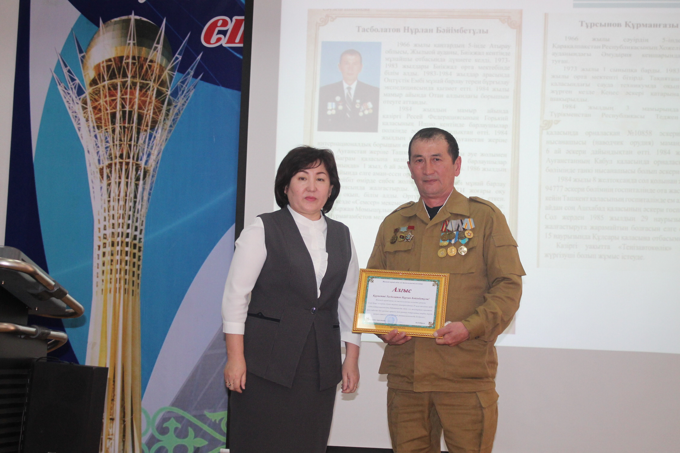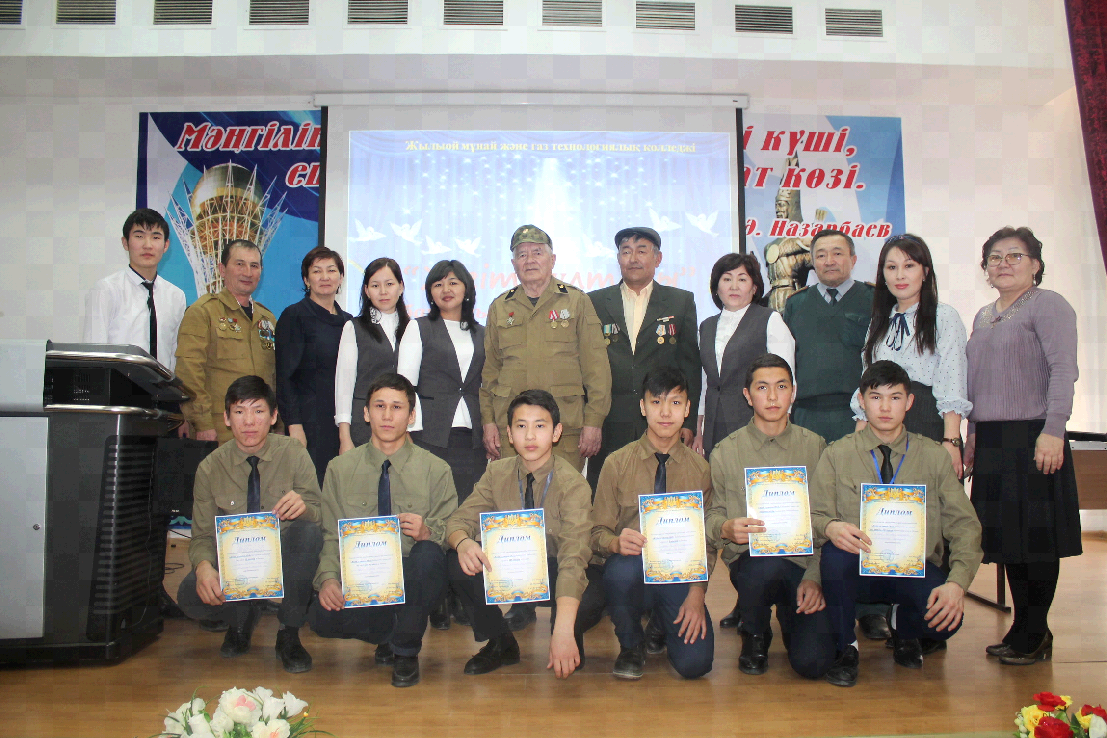 15 ақпан – Кеңес әскерлерінің Ауған жерінен шығарылған күні. Осыған орай бүгін колледжімізде директордың тәрбие-ісі жөніндегі орынбасары Қосымбаева Торғын Орынбасарқызының ұйымдастыруымен Ауған соғысы ардагерлерімен кездесу кеші өтілді. Кездесу кешіне арнайы шақыртумен ауған соғысы ардагерлері Қонаров Сисен Атыраубайұлы, Тасболатов Нұрлан Бейімбетұлы,Тұрсынов Құрманғазы Бейімбетұлы келді. Мақсаты:өз Отанына шексіз берілген,потриоттық рухы жоғары, қайсар жауынгер ағалар ерлігін үлгі ету,ауған соғысында опат болған боздақтар рухына тағзым етуге,есімдерін қастерлеуге тәрбиелеу.