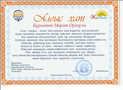 Жастар ресурстық орталығының басшысы "Жас Отан" Жастар қанатының жетекшісі М.Қабиденов 1 наурыз-Алғыс айту күнімен шын жүректен құттықтай отырып, аудан көлемінде мемлекеттік жастар саясатын дамытуға атқарған қызметі мен азаматтық белсенділігі үшін зор алғыс білдірді. Еліміздің өркендеуі мен жастардың белсенділігін арттыруда елеулі еңбек етіп, зор денсаулық отбасына құт-береке, алға қойған бастамаларына толағай табыс абырой мен бедел биіктерден көріне беруіне шын жүректен алғыс білдірді.