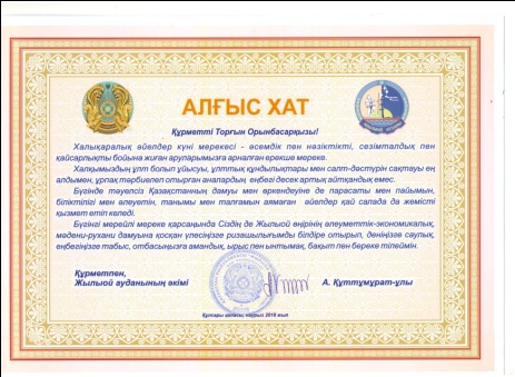 Жылыой ауданының әкімі А.Құттымұрат-ұлы халықаралық әйелдер мерекесі-әсемдік пен нәзіктікті, сезімталдық пен қайсарлықты бойына жиған аруларымызға арналған ерекше мереке дей келе колледжі директорының тәрбие ісі жөніндегі орынбасары Қосымбаева Торғын Орынбасарқызын 8 наурыз әйелдер күнімен құттықтап, Жылыой өңірінің әлеуметтік-экономикалық, мәдени-рухани дамуына қосқан үлесіне ризашылығын білдіре отырып, деніне саулық, еңбегіне табыс, отбасына амандық ырыс пен ынтымақ, бақыт пен береке тіледі.