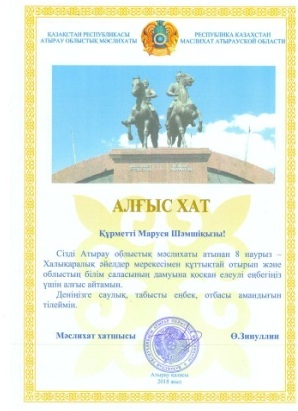 Қазақстан Республикасы Атырау облыстық мәслихат басшысы Ө.Зинуллин Жылыой мұнай және газ технологиялық колледжі директоры оқу-ісі жөніндегі орынбасары Маруся Шәмшіқызын Атырау облыстық мәслихаты атынан 8 наурыз-Халықаралық әйелдер мерекесімен құттықтай отырып және облыстың білім сапасының дамуына қосқан елеулі еңбегі үшін алғыс білдіріп, деніне саулық, табысты еңбек, отбасы амандығын тіледі.