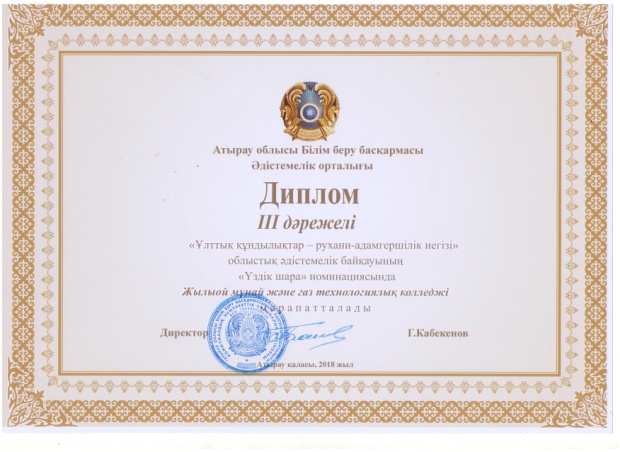 Атырау облысы Білім беру басқармасы Әдістемелік орталығы «Ұлттық құндылықтар-рухани-адамгершілік негізі» облыстық әдістемелік байқауының «Үздік шара» номинациясында Жылыой мұнай және газ технологиялық колледжі ІІІ дәрежелі дипломмен марапатталды.