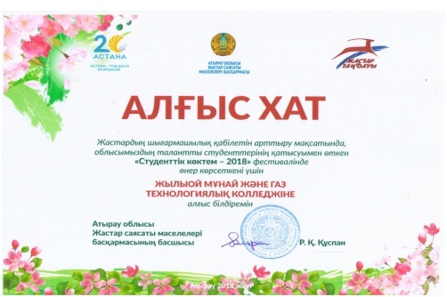 Атырау облысы жастар саясаты мәселелері Атырау облысы Жастар саясаты мәселелері басқармасының басшысы Р.Қ.Құспан Жастардың шығармашылық қабілетін арттыру мақсатында, облысымыздың талантты студенттерінің қатысуымен өткен «Студенттік көктем-2018» фестивалінде өнер көрсеткені үшін Жылыой мұнай және газ технологиялық колледжіне алғыс білдірді.